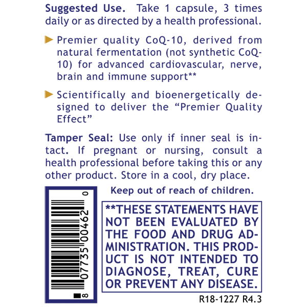 Premier CoQ-10 contains natural, fat-soluble ubiquinone. It is a product of choice when selecting a CoQ-10 dietary supplement for several important reasons. This CoQ-10 is produced through a natural fermentation process which yields 100 mg/capsule of the bioavailable, preferred trans isomeric form of CoQ-10 (not the less desirable cis isomer form). This process does not use polysorbate 80 (an emulsifier made from polyethoxylated sorbitan), undesirable flowing agents or other excipients. The natural trans isomer of CoQ-10 is the most desirable because it is identical to the CoQ-10 produced by the cells in the body. CoQ-10 is found in the highest concentrations in body tissues with the highest rate of metabolic activity and energy demands (such as in the heart, muscle, liver, kidney and brain).