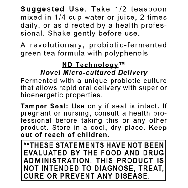 Using only premier quality green tea that has been micro-cultured with probiotics, Green Tea-ND can be rapidly absorbed so it immediately goes to work. Even those with poor digestion can enjoy the full benefits of Green Tea ND’s highly bio-available, liquid nutrients. No other form of green tea can offer this type of phytonutrient bioavailability and quality.