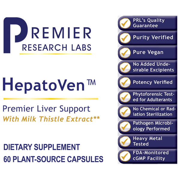 Premier Research Lab’s liver support formula, HepatoVen™, is a comprehensive, multi-botanical formula that showcases the premier quality extracts of milk thistle seed and artichoke leaf.  This formula clinically delivers 510 mg of milk thistle extract (per 3 capsules) with standardized, HPLC-verified silymarin (45% concentration) to ensure an effective dosage to support liver health concerns. Silymarin, a key phytochemical in milk thistle seed, is a highly active flavonolignan traditionally used for its hepato-supportive and antioxidant properties to promote the healthy structure and function of the liver.