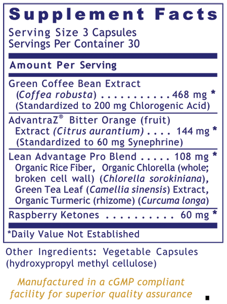 Premier Lean Advantage™ is not a “JOLT product” loaded with artificial stimulants to try to rev up weak adrenals such as products that contain high doses of guarana or ephedra. So how is Lean Advantage different? Leading the list of all-star ingredients in this formula are heavy hitters like Green Coffee Bean Extract, Citrus Aurantium Extract and Raspberry Ketones. Anchoring these three super stars in our formula is our full spectrum support blend, Lean Advantage Pro Blend, which contains Organic Whole Chlorella (broken cell wall for best absorption), Green Tea Leaf Extract, and Organic Turmeric Rhizome. Wow – now that’s quite a super star blend!