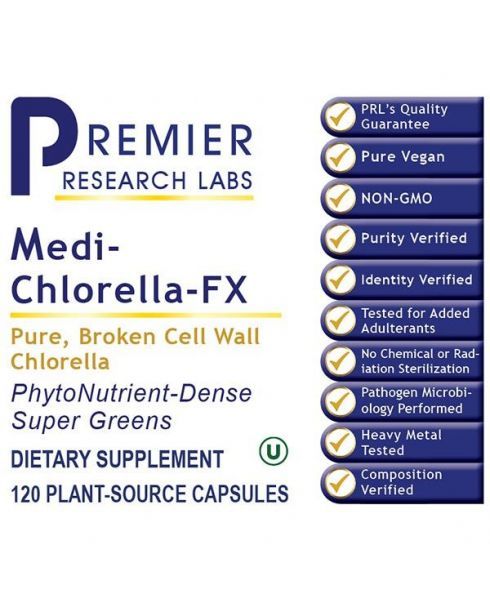 Premier Medi Chlorella-FX is an ancient super food and detoxifier that is rich in chlorophyll, antioxidants, nucleic acids, protein, lipoic acid and natural vitamin B-12.