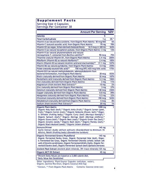 Organic Fermented Barley Grass, Organic Fermented Kale (leaf), Organic Fermented Oat Grass, Organic Fermented Chlorella (whole; broken cell wall) (Chlorella sorokiniana) , Organic Fermented Alfalfa (herb), Organic Fermented Cilantro (leaf), Organic Fermented Spinach (leaf) (Spinacia oleracea)