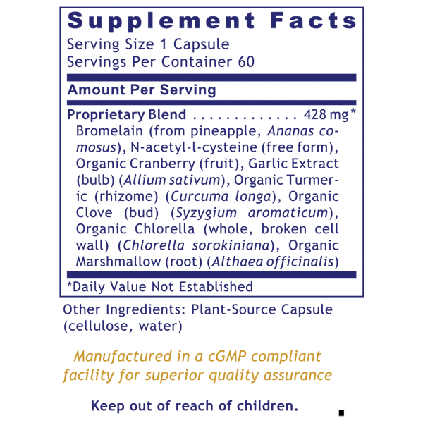 Bromelain (from pineapple, Ananas comosus), N-acetylcysteine (free form), Organic Cranberry (fruit), Garlic Extract (bulb) (Allium sativum), Organic Turmeric (rhizome) (Curcuma longa), Organic Clove (bud) (Syzygium aromaticum), Organic Chlorella (whole, broken cell wall) (Chlorella sorokiniana), Organic Marshmallow (root) (Althaea officinalis)