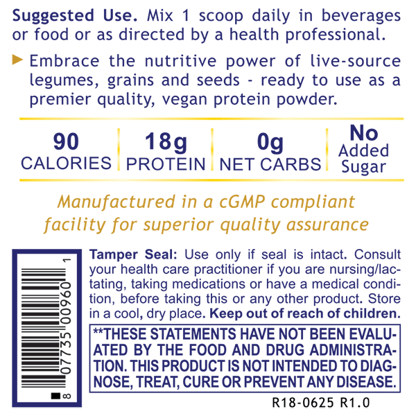 Premier Plant Protein liberates the nutritive power of high quality, living seeds, grains and legumes (pea) as a high quality, vegan protein powder. This product features six premier types of plant-based protein, including premier quality pea protein, rice protein, pumpkin seed protein, hemp seed protein, quinoa seed protein and pomegranate seed protein. Premier Plant Protein is an excellent source of complete protein, providing 18 grams, or 36% of the Daily Value, plus it has all of the essential amino acids naturally present in plant-based sources.